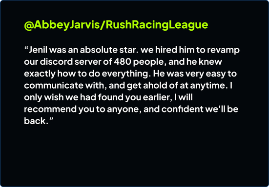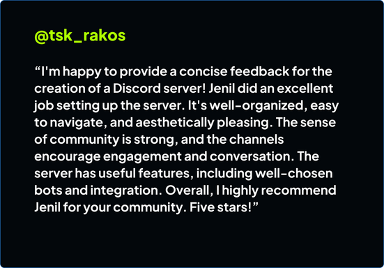 Hi, I'm Jenil - I'm a freelance discord server builder and thumbnail designer based in India.In 2019, I made my first Discord server for a friend who just started his YouTube journey and was looking for a Discord community where he could stream games and chill with his friends. At that time, I didn't know how to make a support ticket system, how to setup auto notifications for streaming, or how to make the server easy to use. Basically, I didn't know anything about Discord except how to create channels.At that time, there were fewer tutorials, so I had to learn everything from scratch by watching YouTube tutorials, reading long documentation, and experimenting with trial and error. With uneven breaks in-between and working on unfinished projects, I made my first Fiverr account in 2022. Within a month, I got my first order which was for $10 and the buyer loved the server so much that they gave me a tip. After this, I was so happy that I can't describe it in words.And today, here I am working as a full-time Discord server builder. Some of my favorite projects in the journey were making a community server for Motionize Productions, TrendyToons, and RushRacingLeague. I don't just make Discord servers, I build communities that succeed.